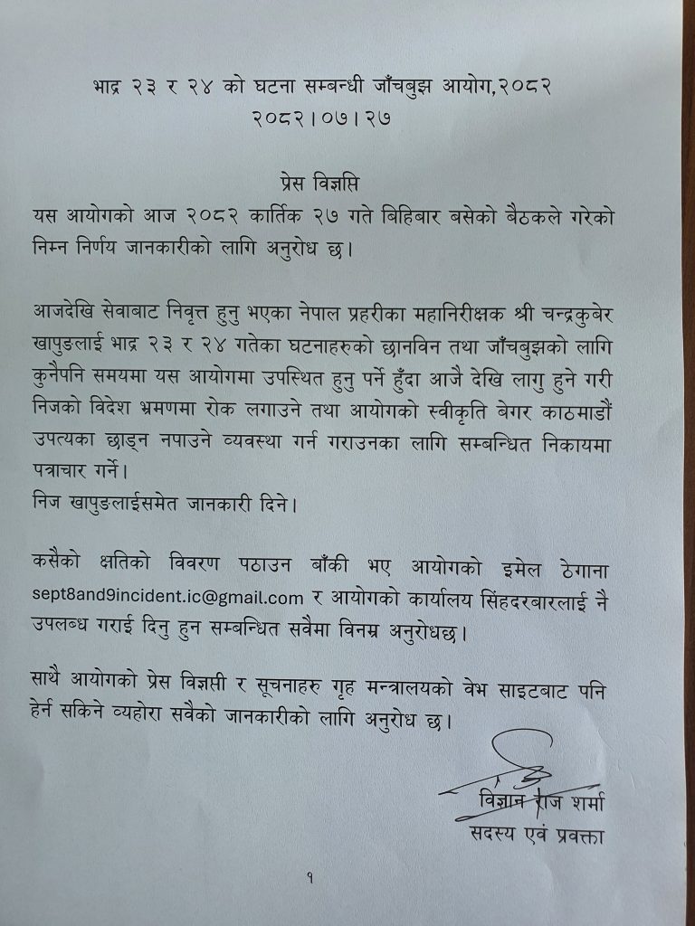 काठमाडौं। भदौ २३ र २४ गतेको घटनासम्बन्धी जाँचबुझ गर्न बनेको आयोगले नेपाल प्रहरीका पूर्वमहानिरीक्षक (आईजीपी) चन्द्रकुबेर खापुङ र अन्य सम्बन्धित अधिकारीहरूलाई घटनाबारे छानबिनका लागि आयोगमा उपस्थित हुन निर्देशन दिएको छ।
