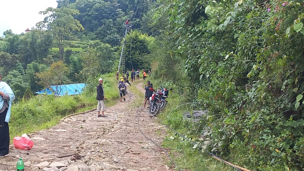 रामेछाप । बिजुलीको पोल र तारमा झुण्डिएको लगातार १० दिन भयो तर पनि थाकेका छैनन्, गलेका छैनन्, उत्तिकै ऊर्जा छ । रामेछापको लिखु तामाकोसी गाउँपालिका–२ सैपुका वडाध्यक्ष सन्तोष पौडेल लगायतका जनप्रतिनिधि र सामाजिक अगुवाको दैनिकी १० दिनदेखि एकनास छ । बिहान उज्यालो हुने बित्तिकै बिजुलीको पोलमा पुग्यो, साँझसम्म बिजुलीको पोल र तारमा झुण्डियो । बेलुका लखतरान भएर घर फर्कियो, बिहान उठेर फेरी उही काम ।
