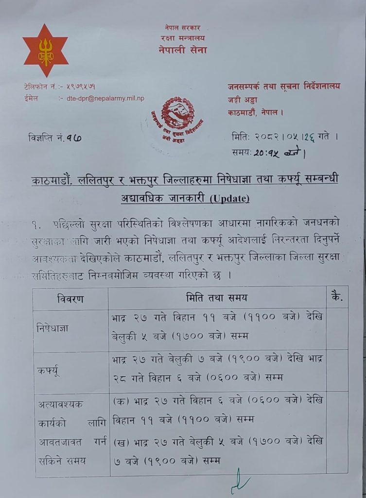 काठमाडौं । नेपाली सेनाले शुक्रबार नागरिकको जनधनको सुरक्षाका लागि काठमाडौं, ललितपुर र भक्तपुर जिल्लाहरुमा निषेधाज्ञा र कफ्र्यू आदेशलाई निरन्तरता दिने भएको छ । एक सूचना जारी गर्दै जनसम्पर्क तथा सूचना निर्देशनालयले आज विहान ११ बजे देखि बेलुकी ५ बजेसम्म निषेधाज्ञा जारी गरेको छ । यस्तै बेलुकी ७ बजे देखि भाद्र २८ गते विहान ६ बजे सम्म कफ्र्यू आदेश जारी गरेको छ ।