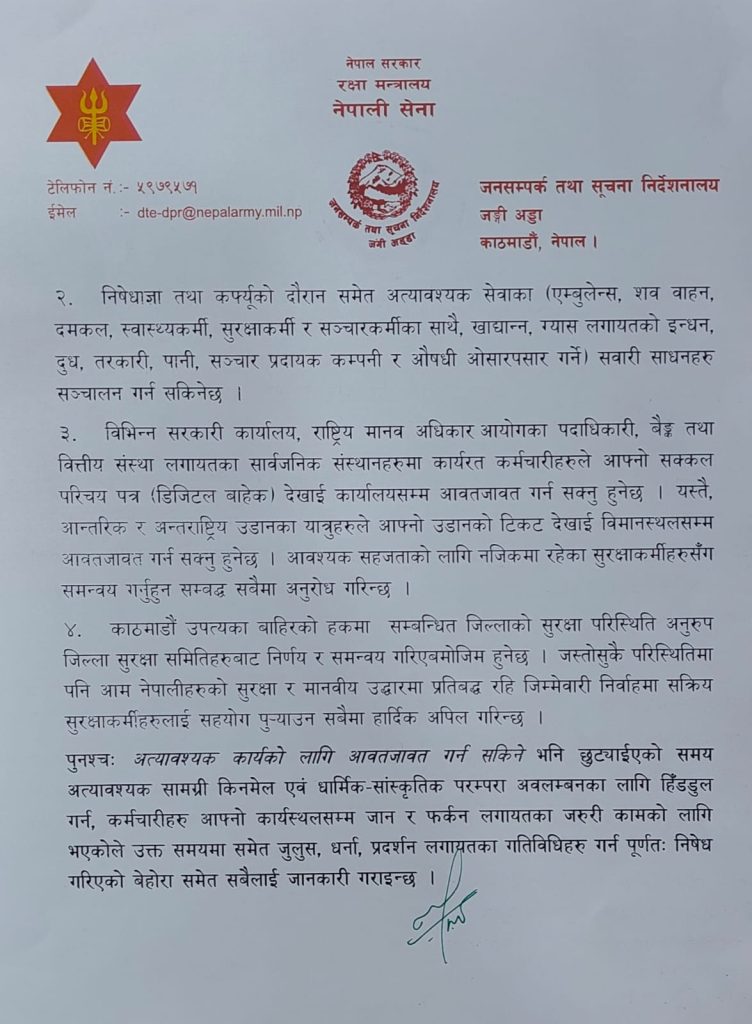 नेपाली सेना जनसम्पर्क तथा सूचना निर्देशनालयका अनुसार अत्यावश्यक कार्यको लागि विहान ६ बजे देखि विहान ११ बजेसम्म र बेलुकी ५ बजेदेखि ७ बजे सम्म आवतजावत गर्न सकिनेछ ।